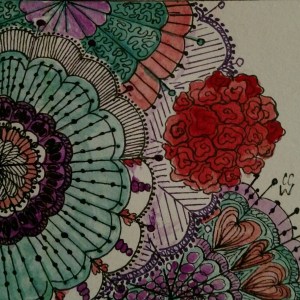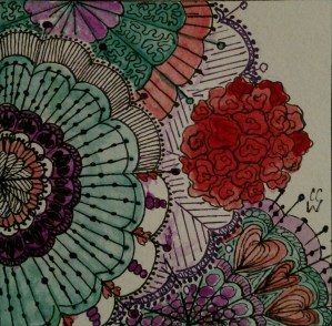 Snother zentangle by CC Willow, Pacific NW artist. Lenche and Petaling in ink and watercolor on acid-free paper.