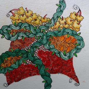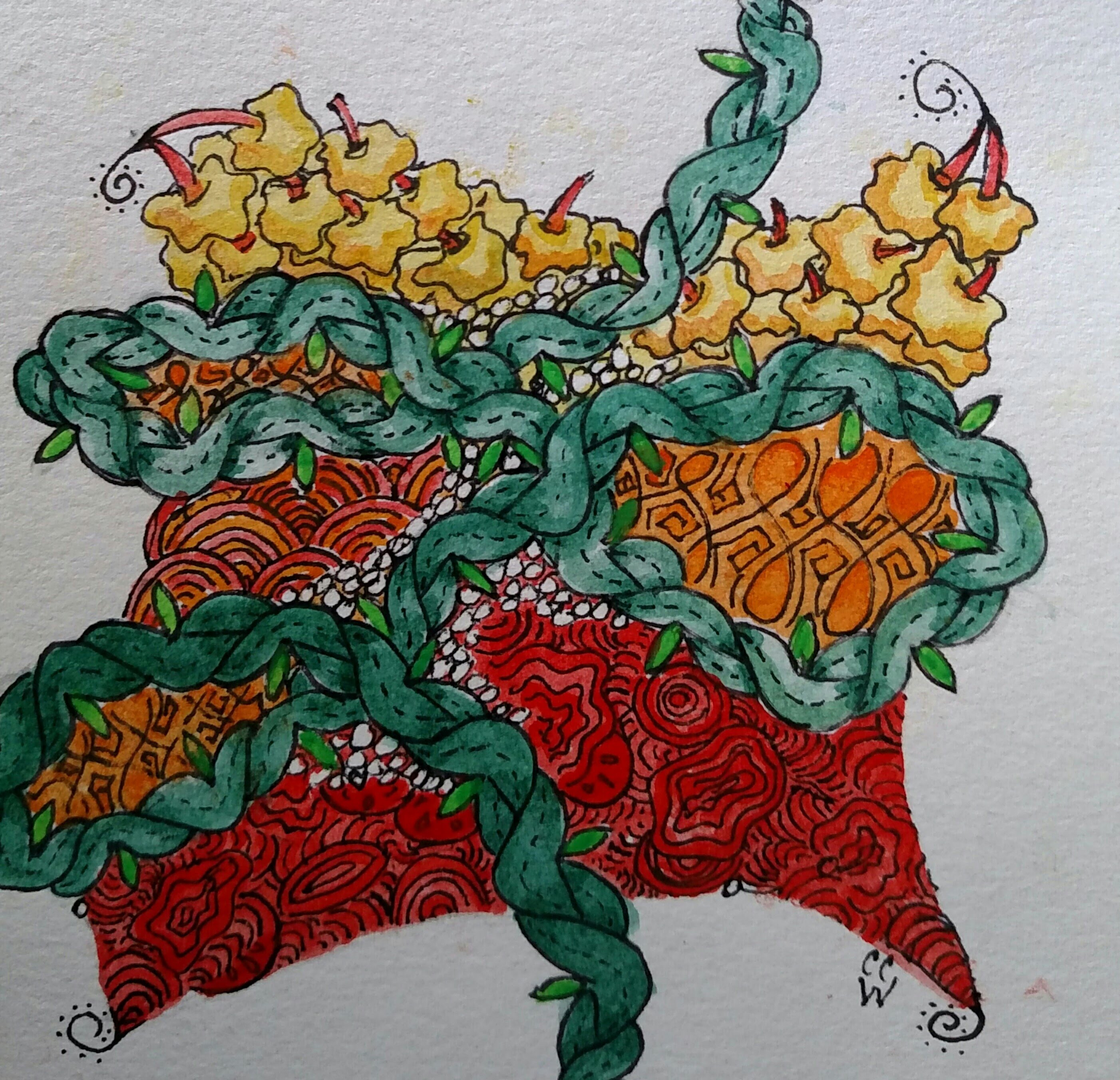 Zentangle by CC Willow featuring Poke Root, Echoism, Isocher, and Flowine in ink & watercolor on actid-free oaoer.