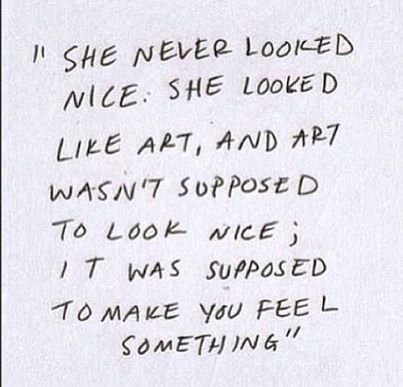 Today’s prompt is “She never looked nice. She looked like art, and art wasn’t supposed to look nice; it was supposed to make you feel something.” Continue reading “Jan 26 prompt”