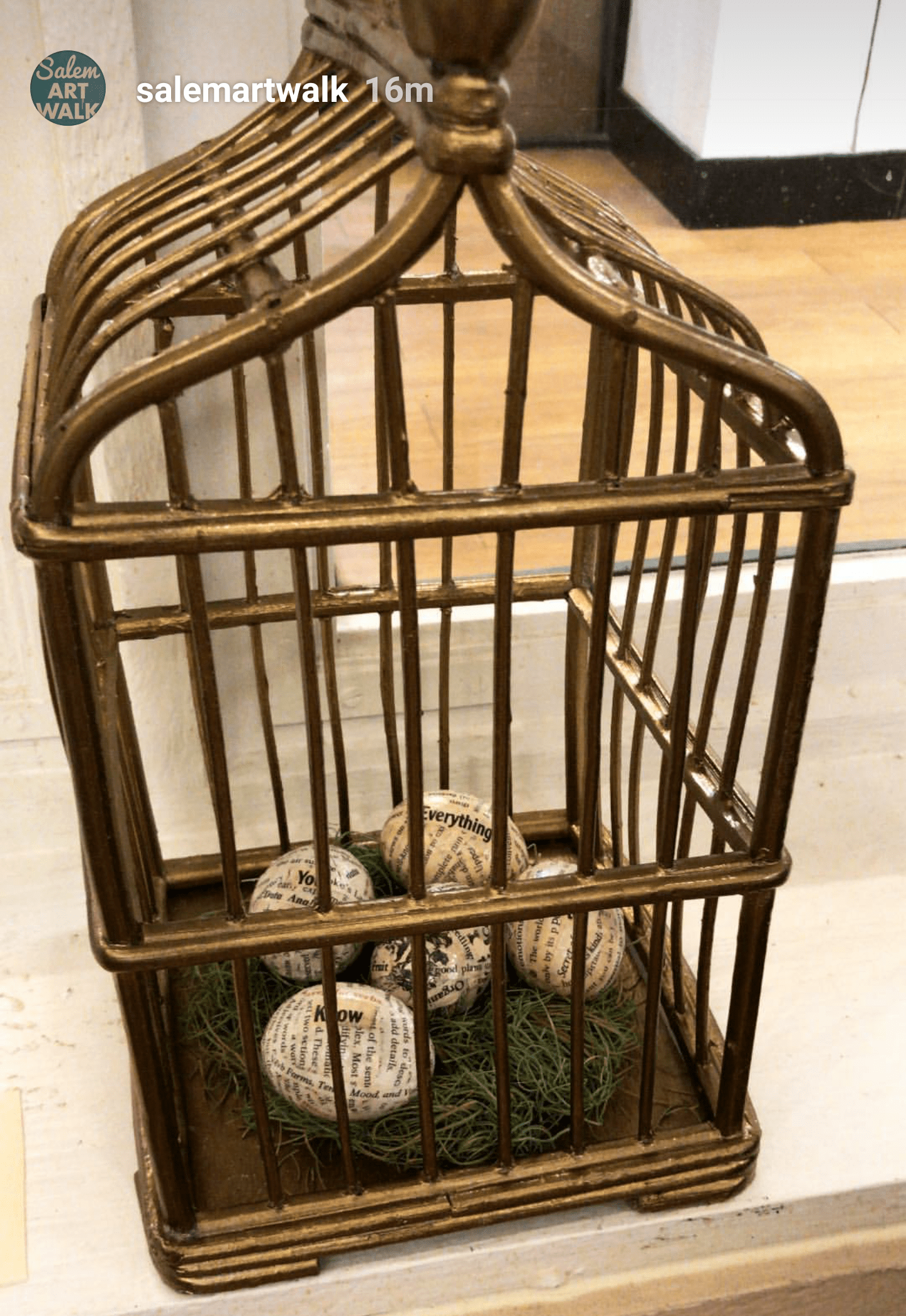 The Cage is Wicker Not Gold by Pacific NW artist CC Willow, Each “egg” represents a different body of higher knowledge: math/Science, Agriculture/Biology, Language/Communication, Ethics/Humanities, and History – all lpcked away in a box that appears to be unassailable golf, yet is just falliable wicker painted gold.