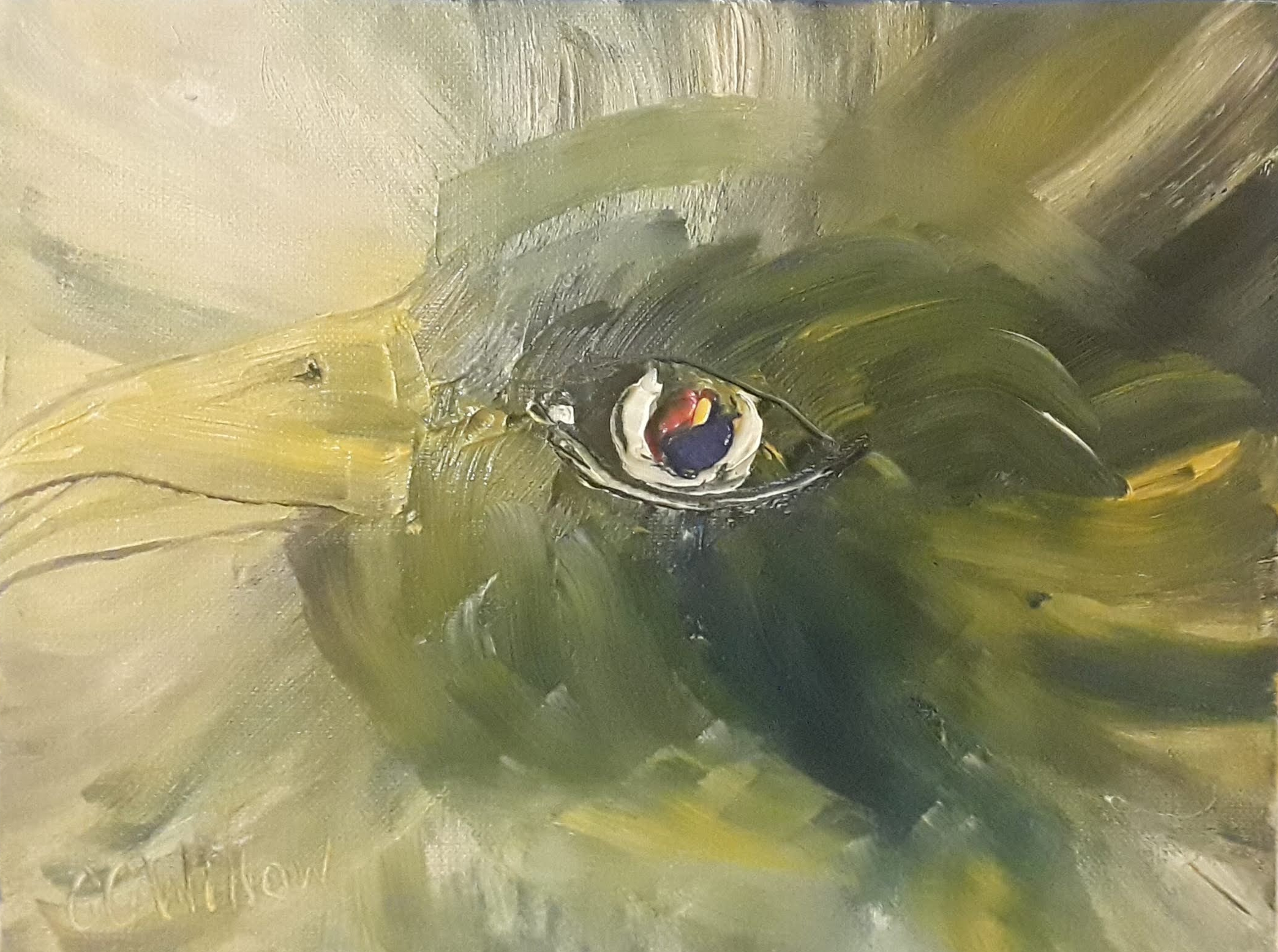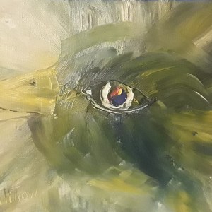 She Watches – an oil painting of a bird from a SHE Project by Pacific NW artist, CC Willow