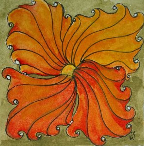 Four O’Clock zentangle by CC Willow using Angel Fish pattern in ink & watercolor
