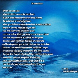 I identify myself as a Pacific Northwest poet. I have been writing poetry since 1976- and yes - I have been using the pen-name Ariel all this time! I can often be found writing in the Willamette Valley, in Pacific forests or along the Coastlines on Oregon.