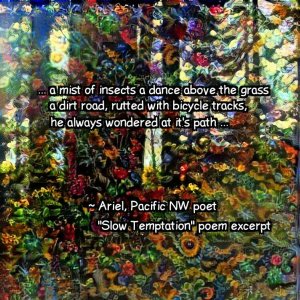 I identify myself as a Pacific Northwest poet. I have been writing poetry since 1976- and yes - I have been using the pen-name Ariel all this time! I can often be found writing in the Willamette Valley, in Pacific forests or along the Coastlines on Oregon.